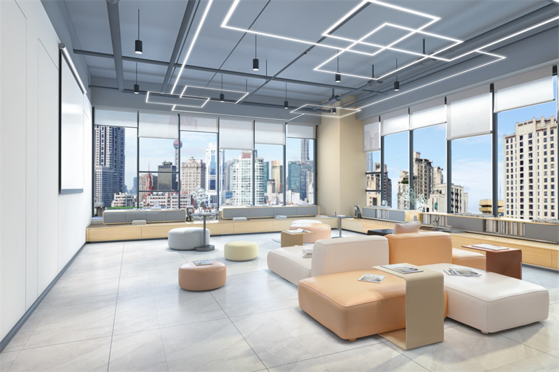 其次讓人感覺溫馨舒適的設計可以讓人們在辦公室更有歸屬感,這離不開辦公室內燈光所營造的氛圍。在燈光方面家裝的燈光比較偏暖色,明度比起辦公室中的強烈的白光相比較暗,可以營造出一種溫馨舒適的氛圍。而辦公室因為自身的屬性需要比較明亮的光線,但是在設計上在辦公室一些通道、展示墻面、文化墻以及多功能區等地方,可以局部使用偏暖色的燈光來和整體空間形成對比,打破辦公室內一成不變的使人疲憊的白光,讓辦公室空間環境增加一些舒適。
